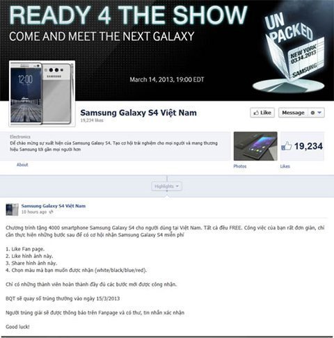 Thông tin về chương trình tặng quà "siêu khủng" này xuất phát từ một fanpage (Samsung Galaxy S4 Việt Nam) mới được tạo ra trên mạng xã hội Facebook vào rạng sáng nay. Hiện tại, điện thoại Samsung Galaxy S4 vẫn chưa chính thức ra mắt, nhưng ước tính trị giá của món quà tặng 4.000 chiếc này có thể lên tới khoảng 50 đến 60 tỷ đồng.